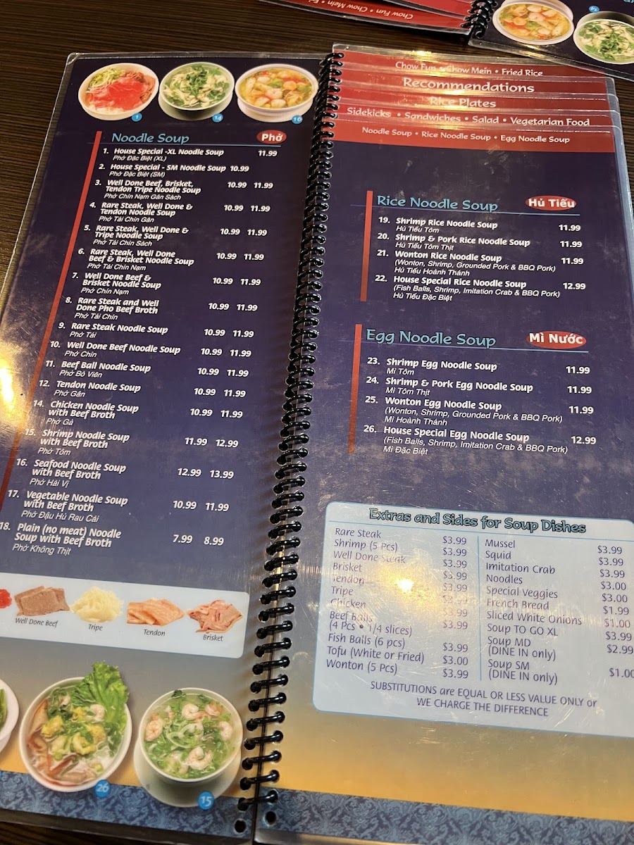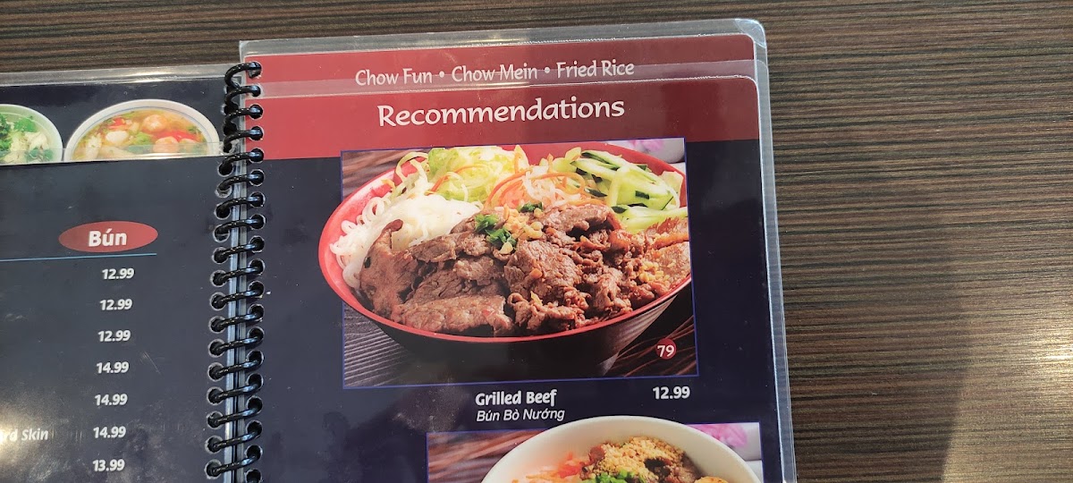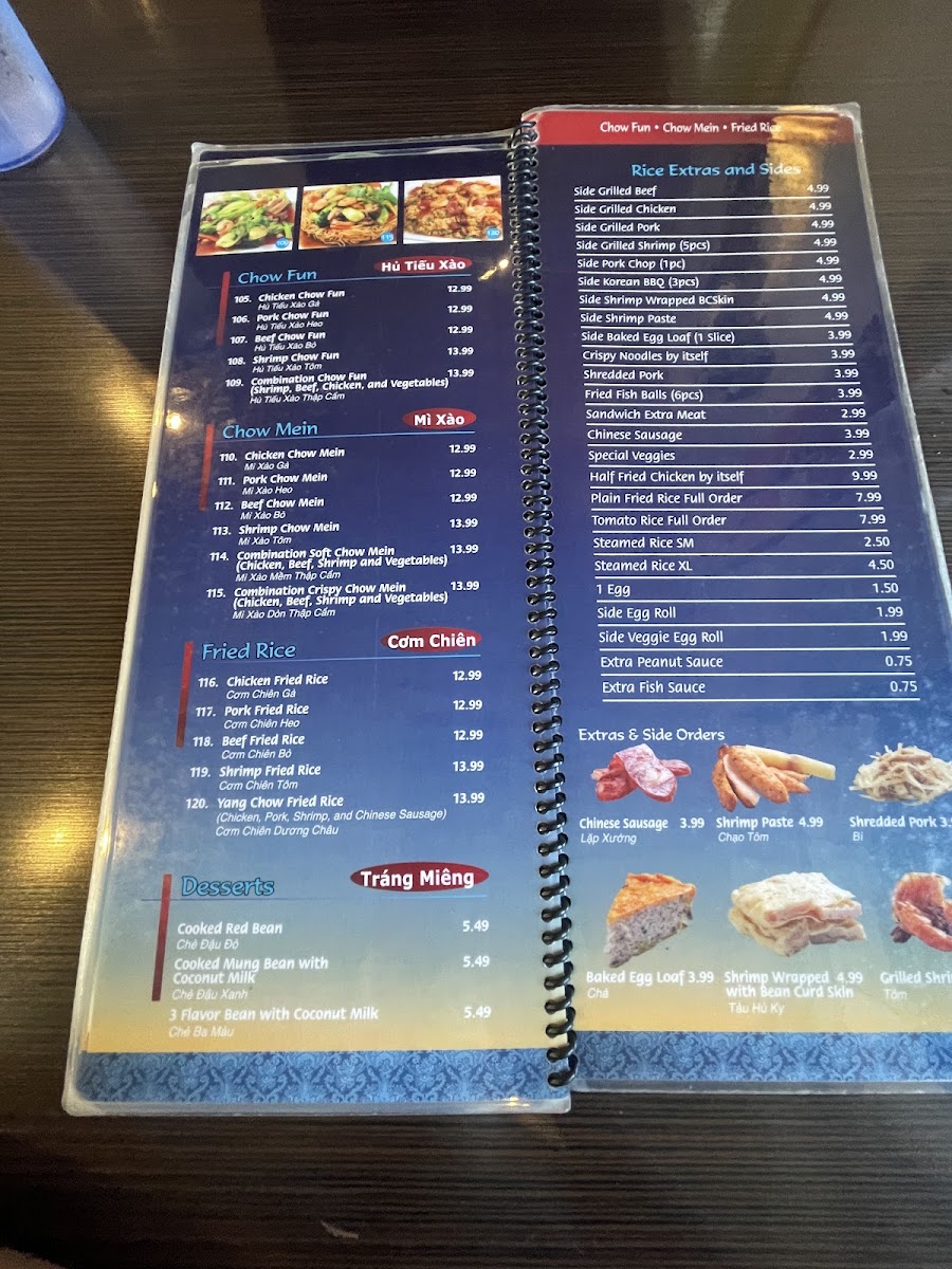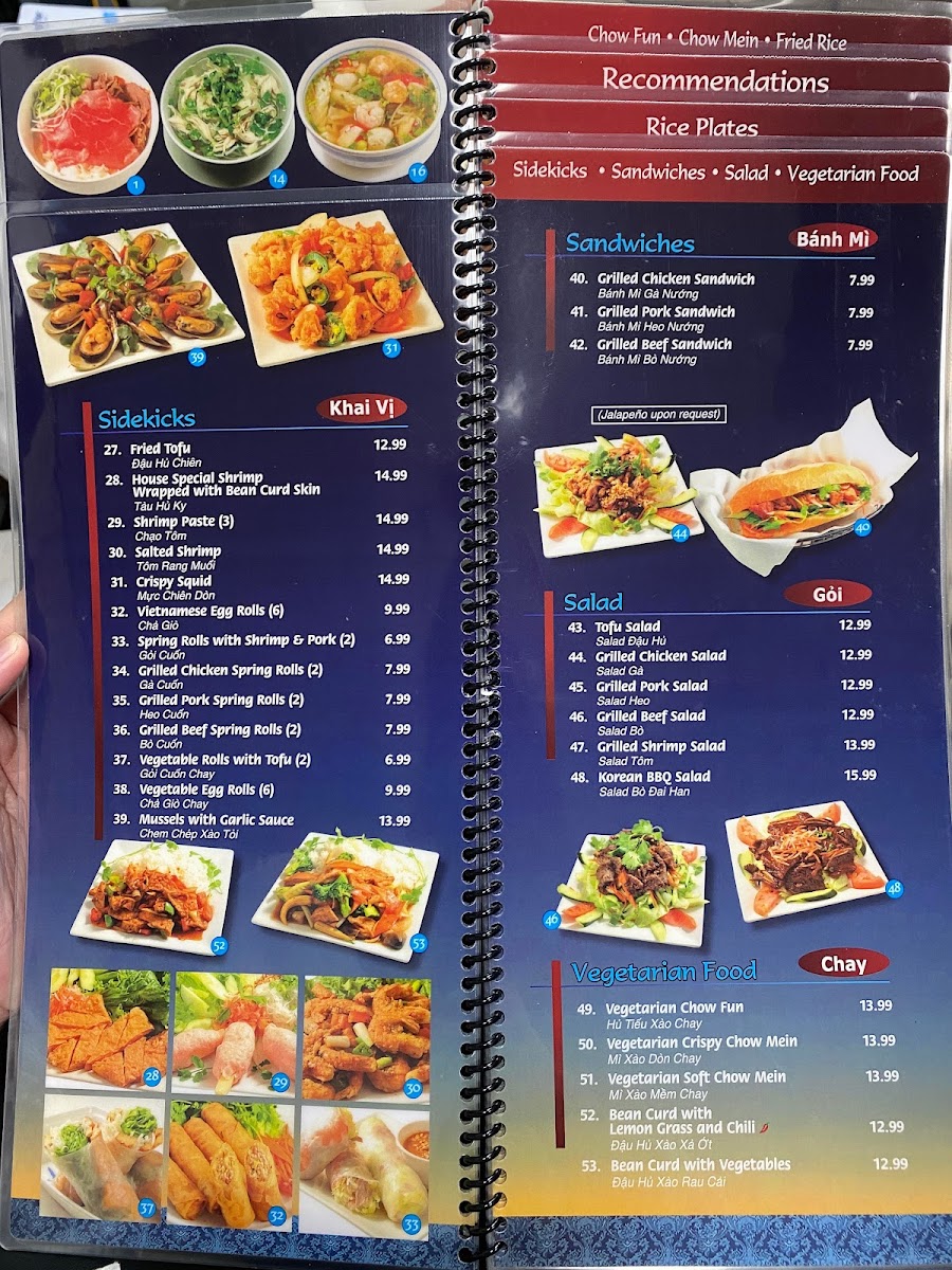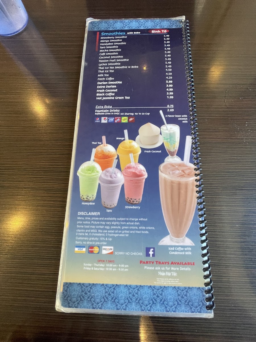 Good food but different than I am used to no lemongrass dishes. Most dishes are made without heat spices. There are soups instead of Phò. You won’t find salted lemonade, avocado or jackfruit smoothies. With that said they do have an extensive menu which is very tasty.